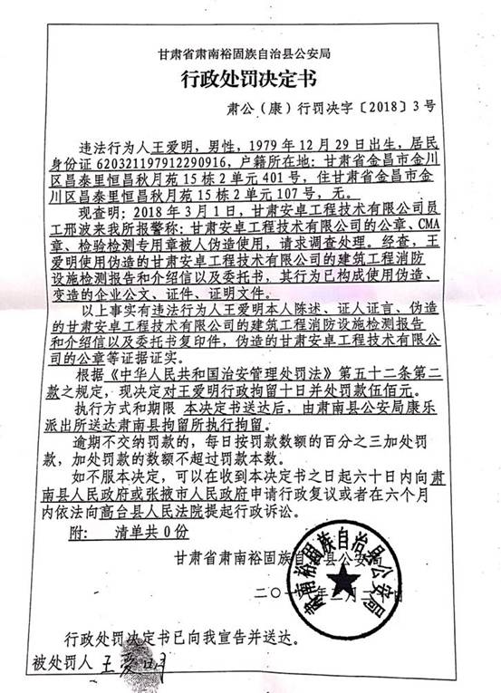 《甘肅省肅南裕固族自治縣公安局行政處罰決定書》肅公(康)刑罰決字【2018】3號(hào)文件,查明王愛明偽造甘肅安卓工程技術(shù)有限公司的建筑工程消防設(shè)施檢測(cè)報(bào)告、介紹信、委托書、公章等違法事實(shí)。